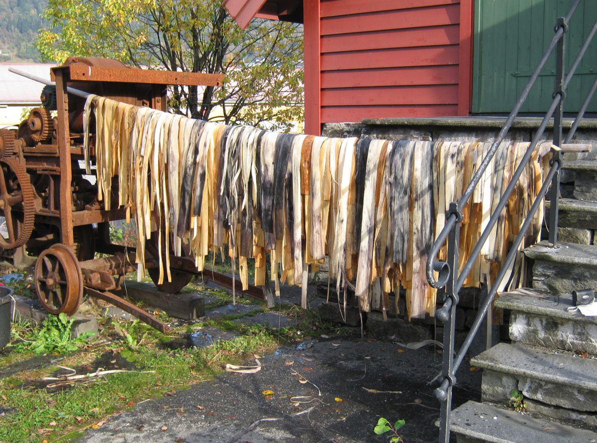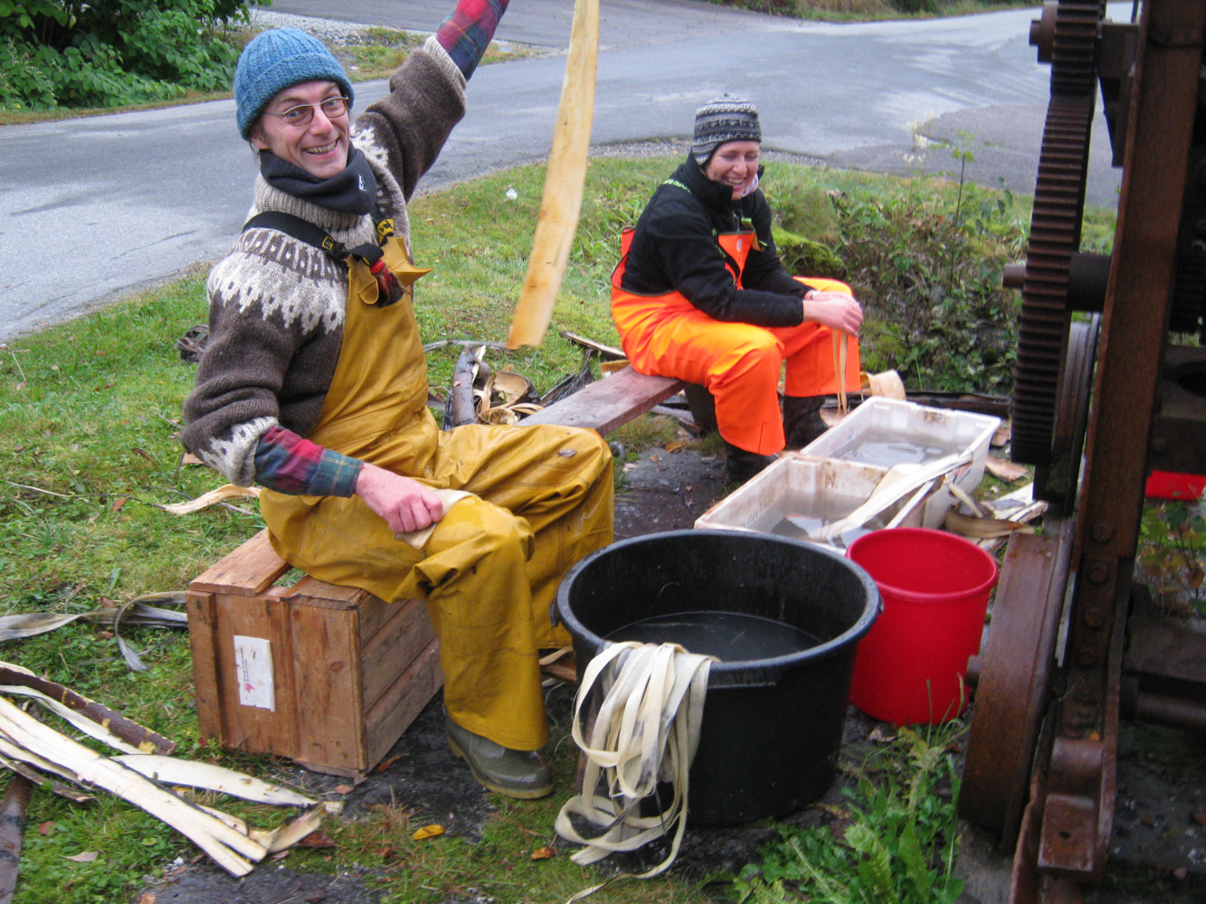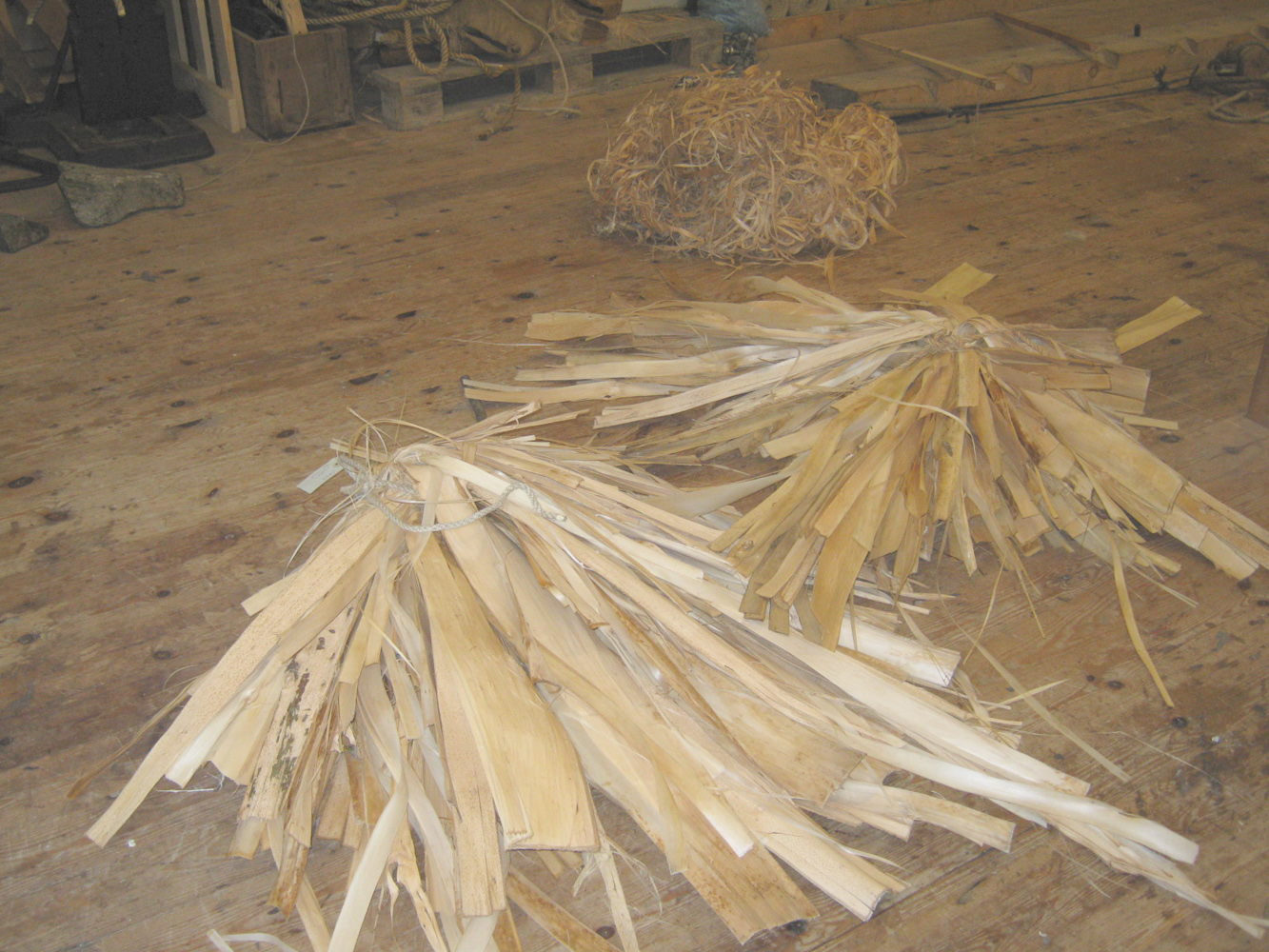 Here you can see some of the lime tree bark fibres drying. Once the fibre sheets are dry they are again split lengthwise into strips about 5 to 10mm wide before being spun into individual strands which are then spun into rope. We didn’t get that far through the process while I was there. The two ropemakers were busy researching the now lost technique of making rope from seal and walrus skin. They told me if I thought Lime tree bark stank that I should get a noseful of putrid seal skin. Apparently you have to chew it to be able to make the rope. Ugh!