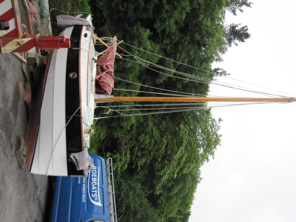 You’ll have to excuse the bad set of some of the sails in these two photos I still had to adjust the lacing on the main and when stepping the mast the jib block ended up on the wrong side of the mast. I took these at the end of a series of very long days.