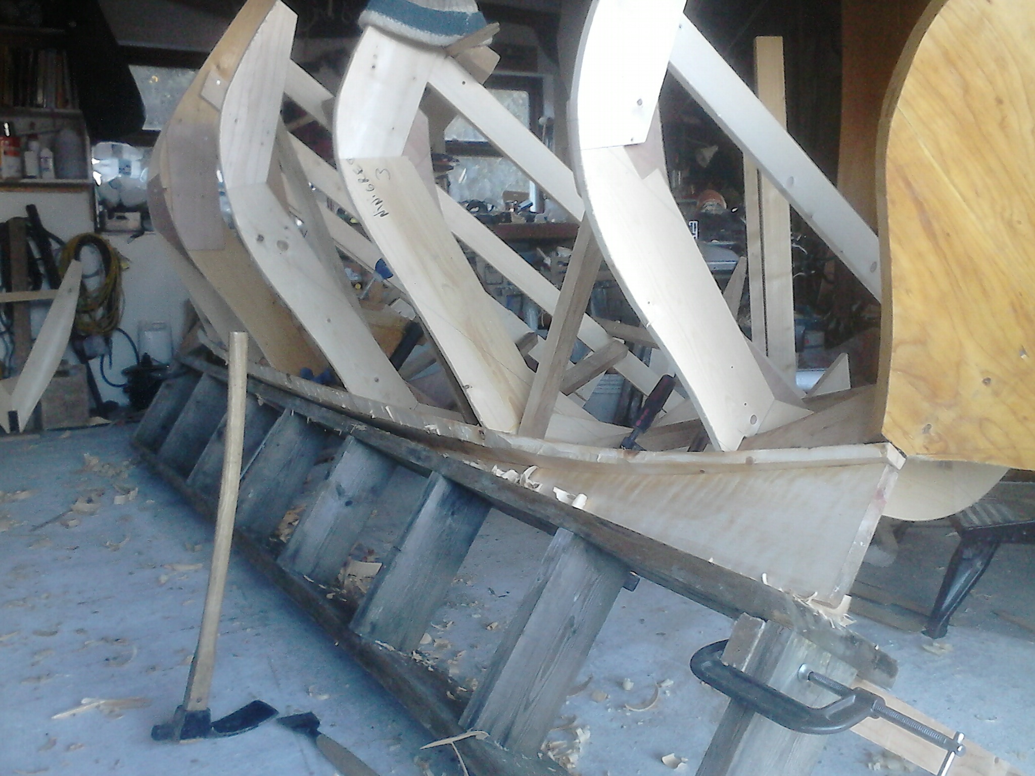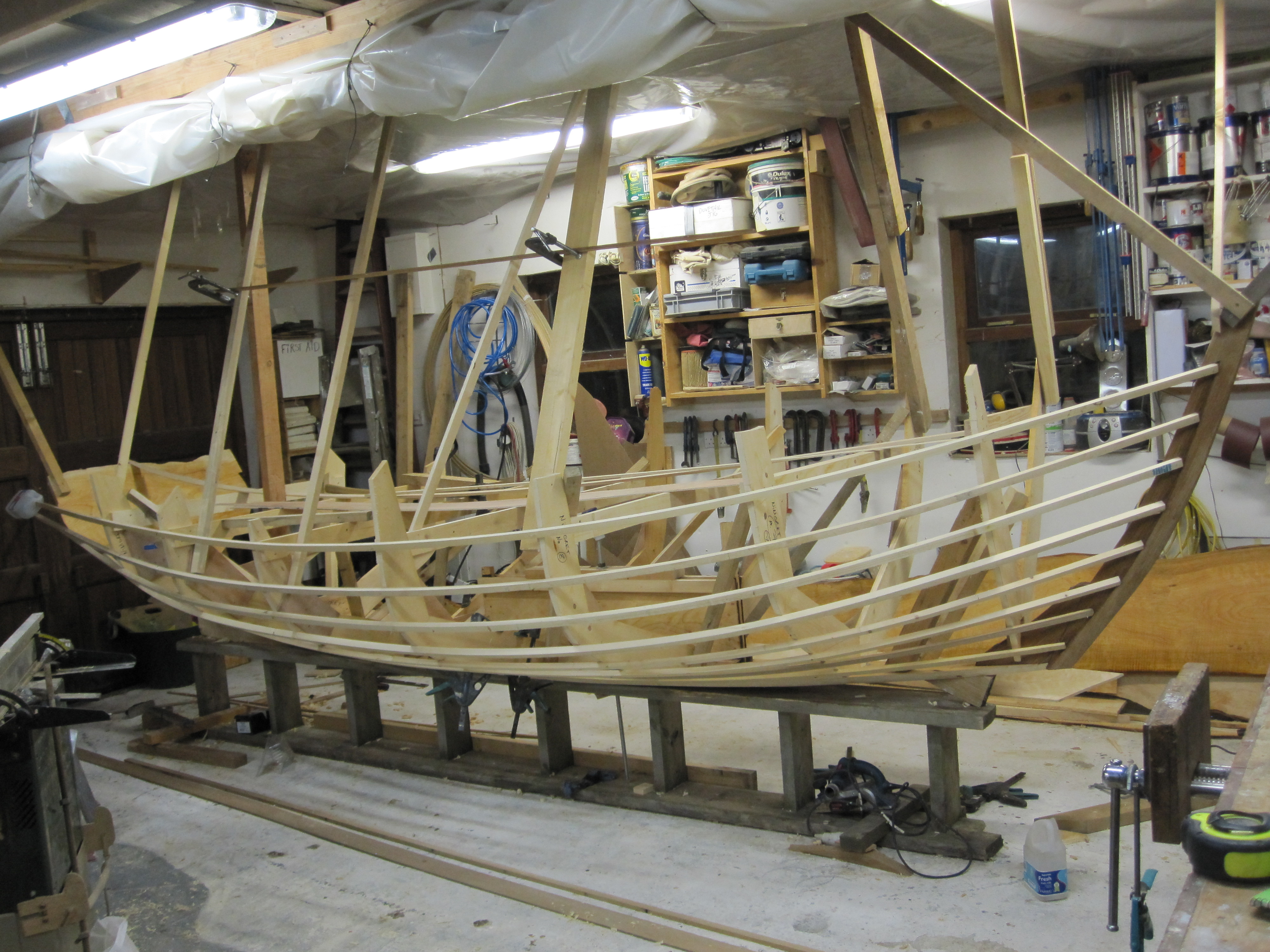 Well here she is with the molds set up on the keel and the planking battens in place. I’ve described the boat as a traditional experiment in that the hull form got its inspiration from a mixture of Architectura Navalis from which I got the wineglass hull sectioins and American wherry’s from which I took the plank keel. With a few ideas of my my own, which are the real experiments hopefully they will be successful ideas. And that it will be built using traditional methods and materials.